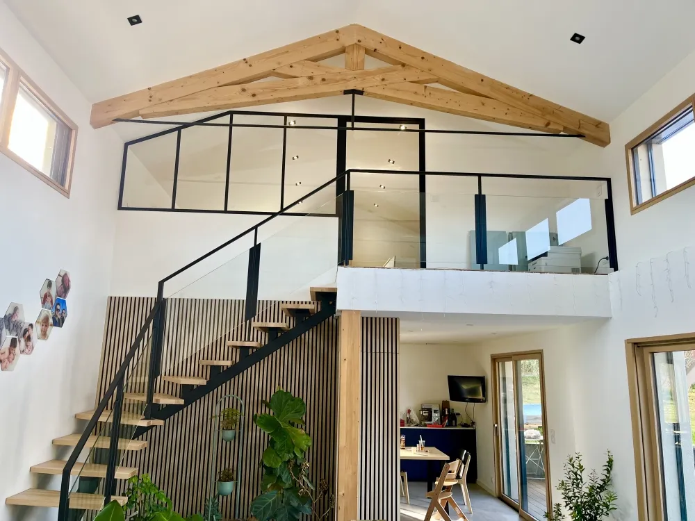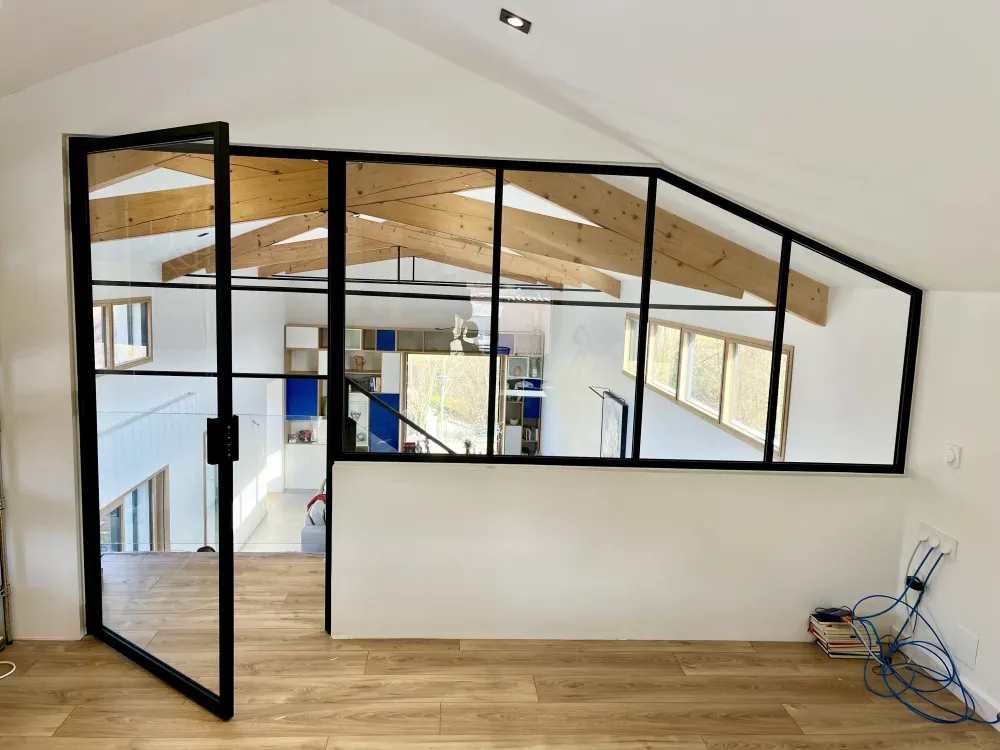 Nous avons récemment conçu et installé une verrière intérieure sur mesure, accompagnée de sa porte verrière assortie, pour structurer un espace tout en conservant un maximum de lumière naturelle.